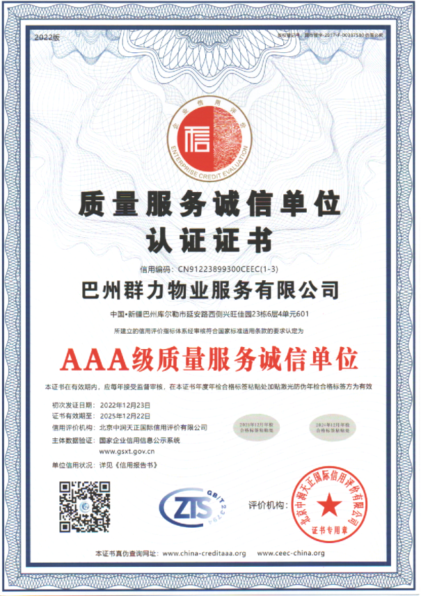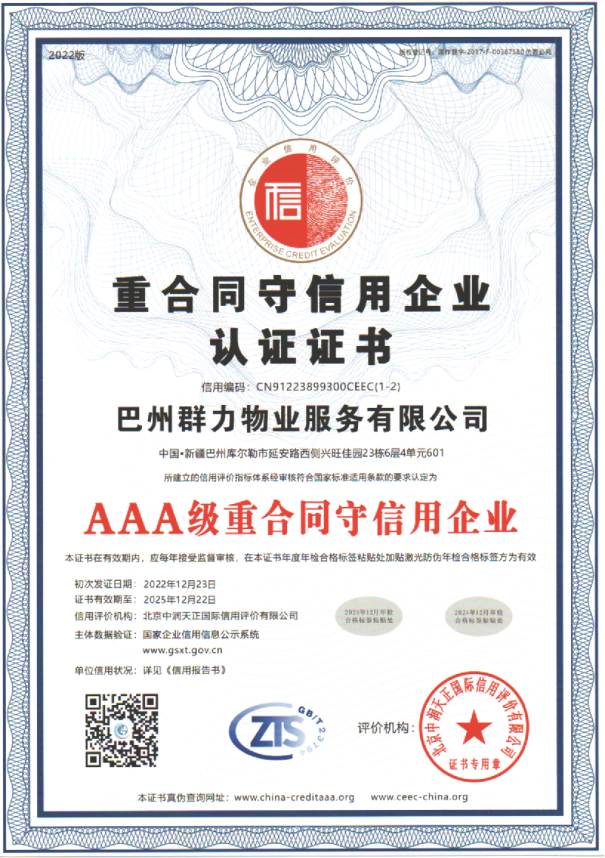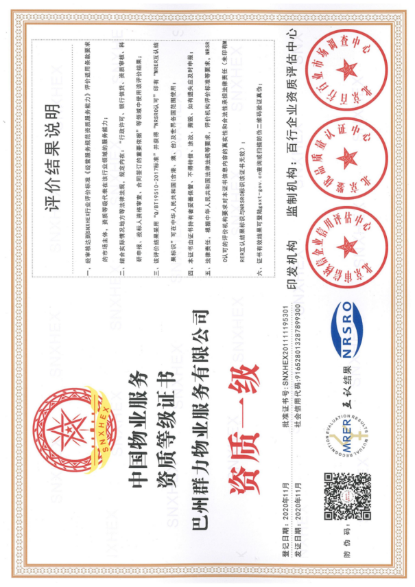 巴州群力物業服務有限公司 2015 年 8 月 10 日注冊成立,是 具有《中國物業服務資質等級證書資質一級》的物業服務企業。 目前在庫爾勒市區已管理服務 20 個小區,介入咨詢和接管物業的 總建筑面積超過 150 萬平方米。2020 年,在《建設街道各社區轄 區小區物業評分》綜合考評活動中,群力物業在 32 個小區綜合考 評中以 95 分的業績榮獲前茅。